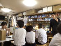 本の内容をもっとしりたいと、本の紹介後に職員の方に質問する1年生。