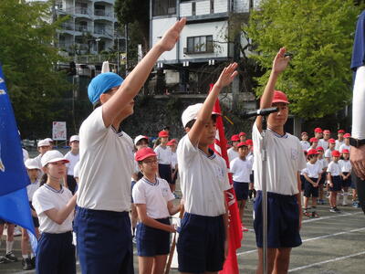 1年生のしっかりとした運動会開会の言葉、カラーリーダーによる選手宣誓、いよいよ運動会の始まりです。